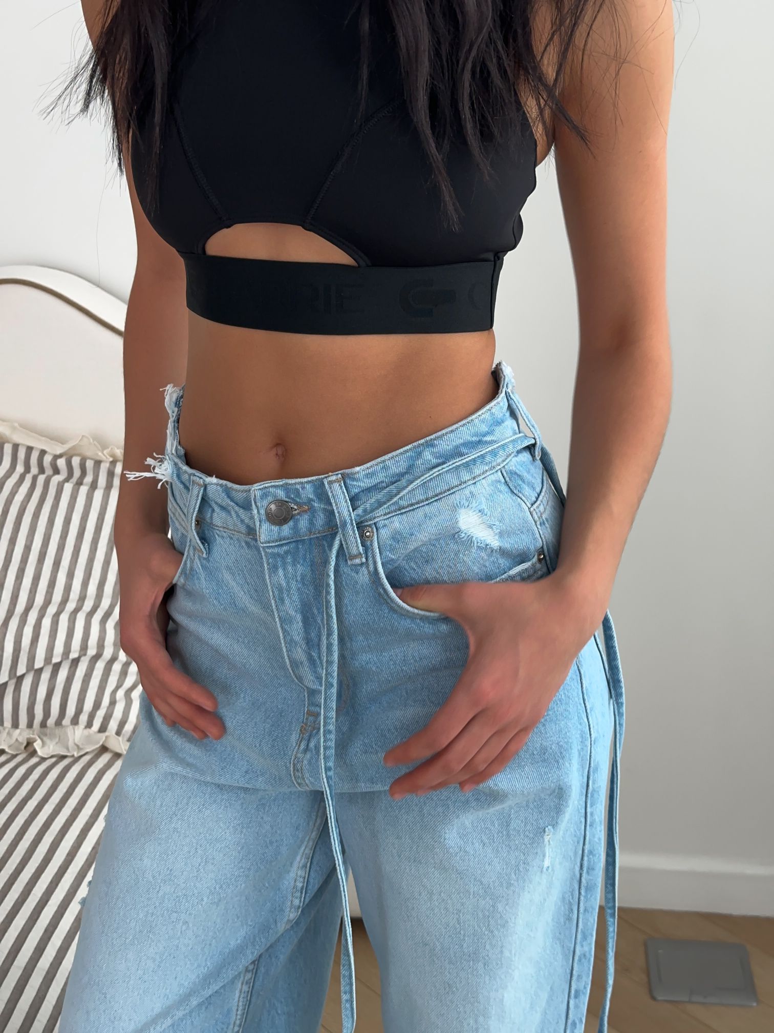 Особенность кроя джинсов кроется в их названии: wide leg с английского переводится как «широкая нога». Так что первый критерий, по которому вы точно узнаете актуальную пару, — широкие штанины. Они вообще не должны облегать ногу, в том числе свободно сидеть в бедрах. Посадка у джинсов wide leg может быть разная: посадка на бедрах наверняка понравится тем, кто все еще не устал от стиля нулевых. А тем, что ищет что-то более классическое, советуем присмотреться к моделям со средней и высокой посадкой. Последняя, кстати, поможет скорректировать пропорции силуэта, визуально увеличит рост и сделает ноги более стройными.