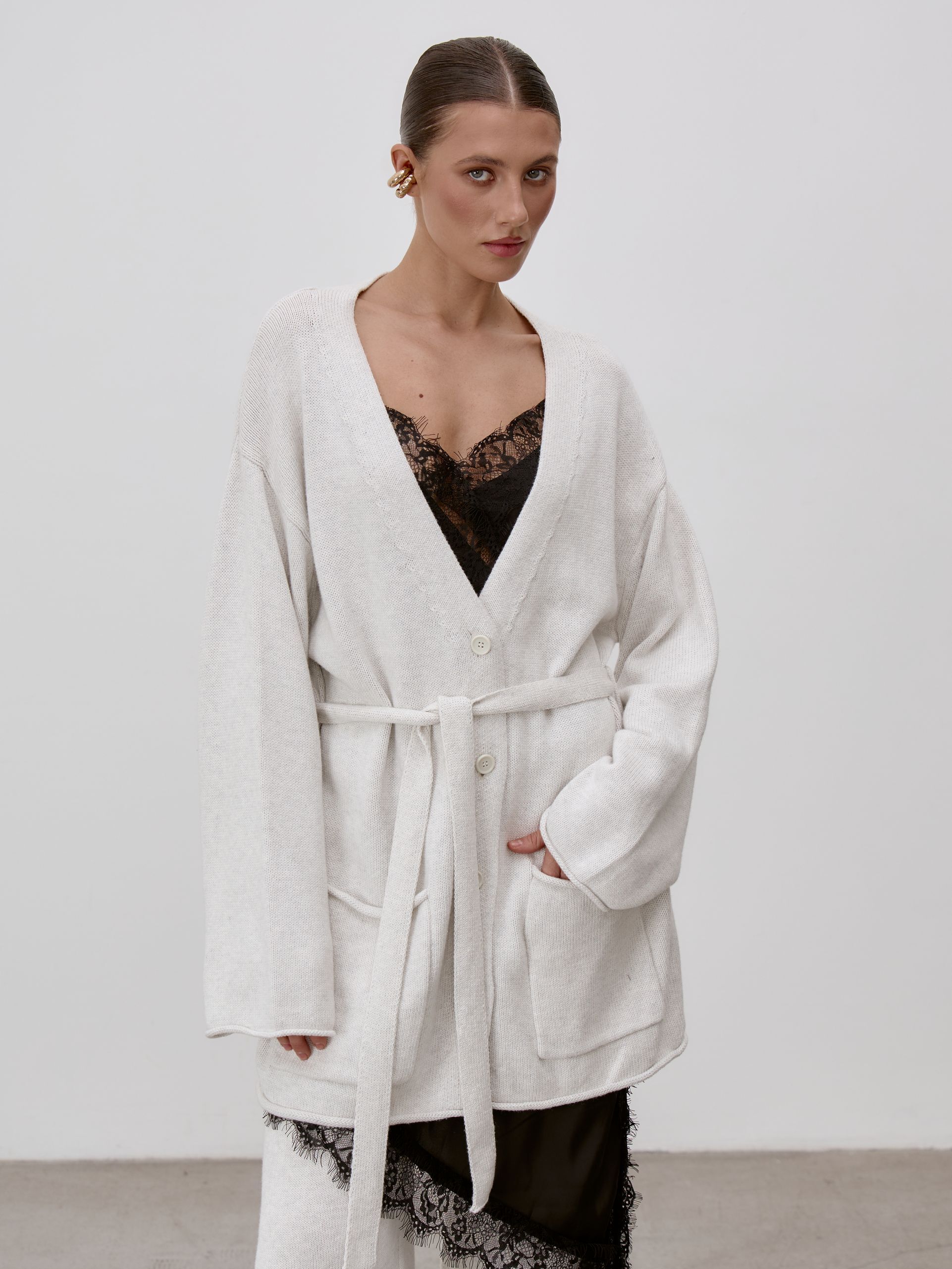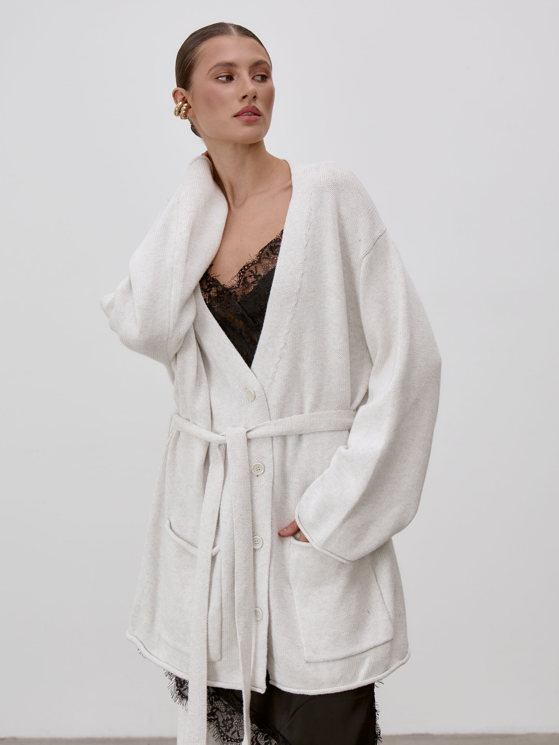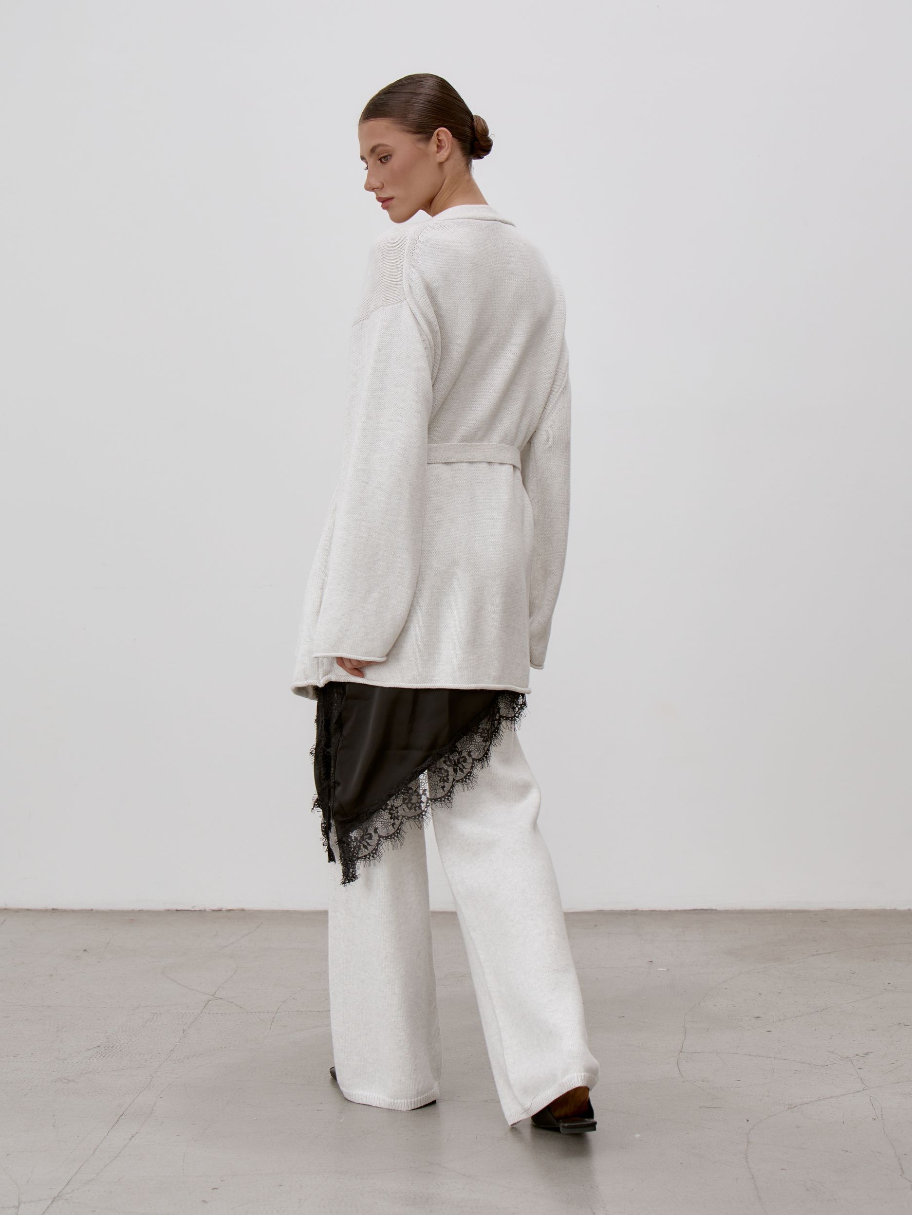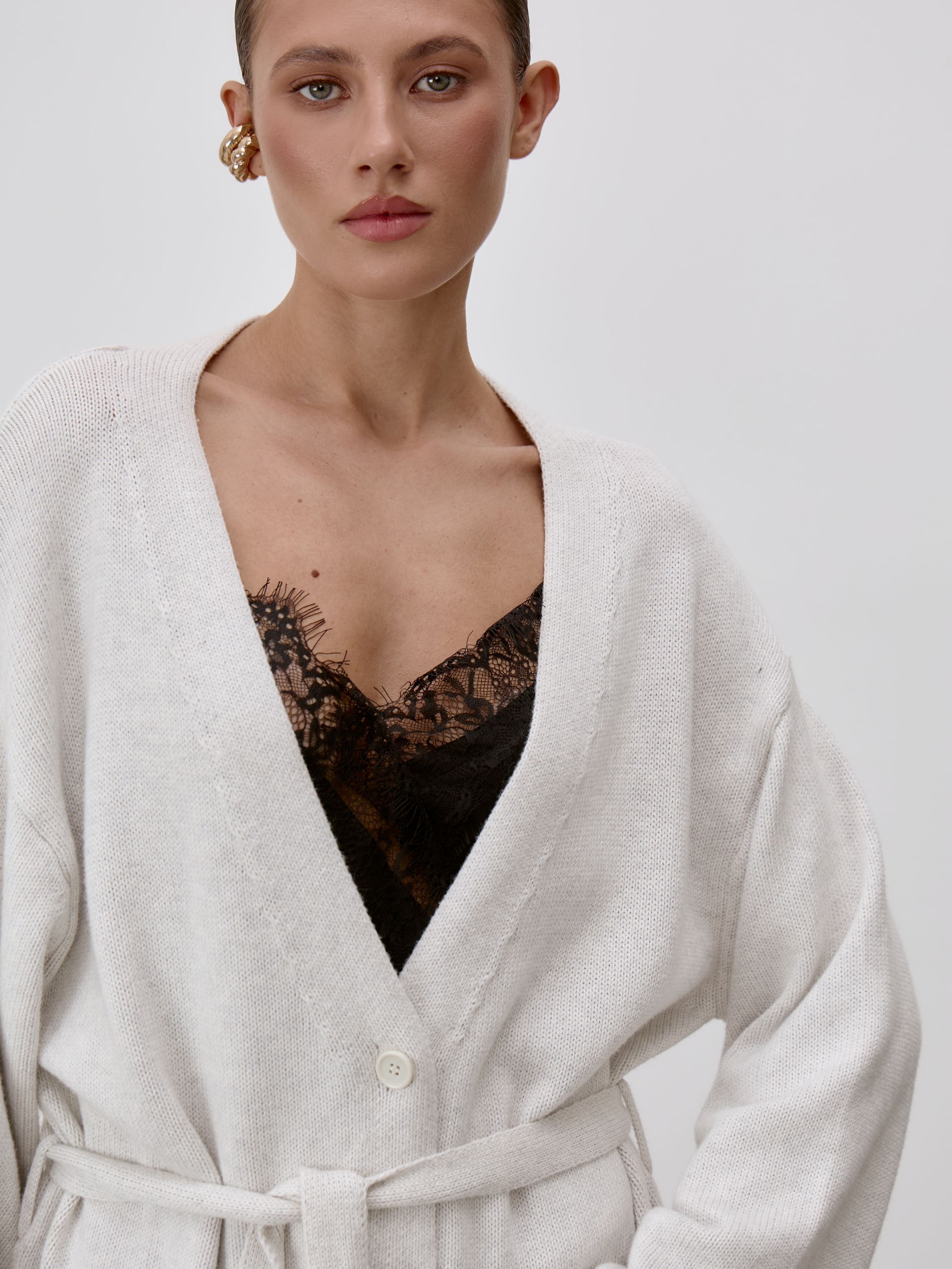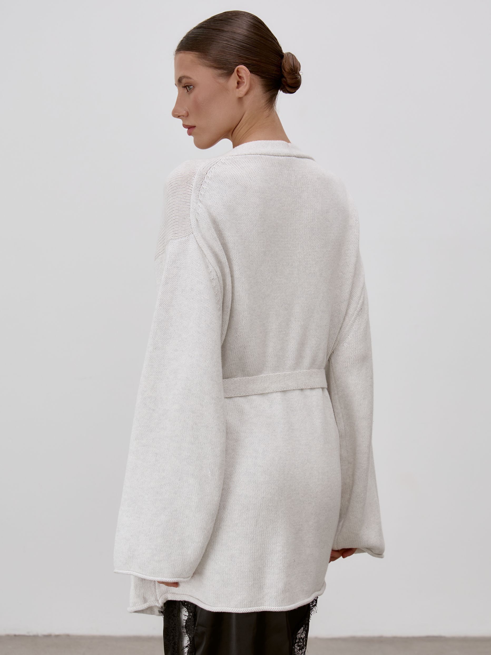 Страна: РоссияСостав: 95% хлопок 5% кашемирУход: ручная стирка при t° не более 30°Параметры модели: 83 / 62 / 90 , рост 172 (на модели размер S)